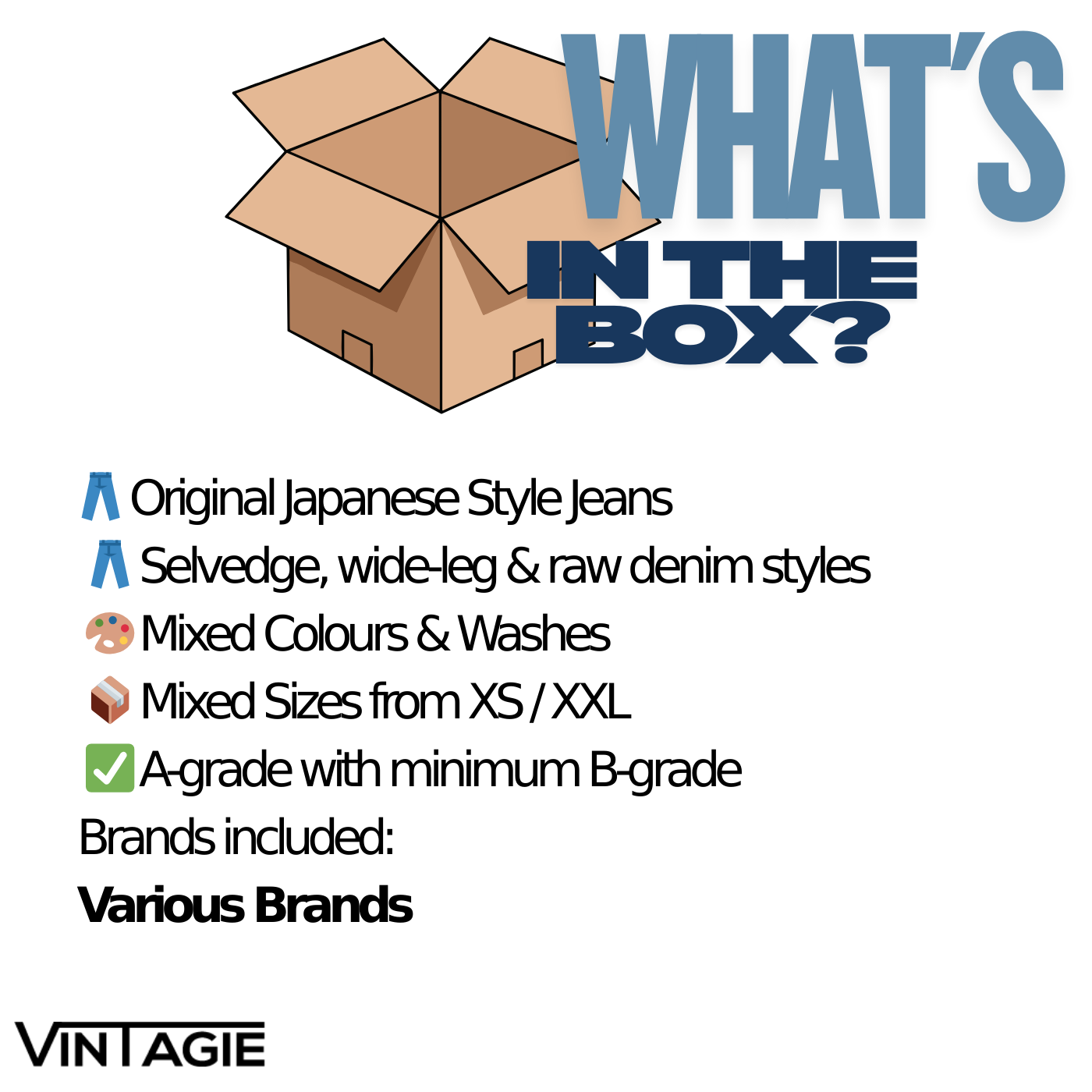 Bij ons shop je tweedehands kleding per stuk. Jij bepaalt precies welke items je wilt — het enige wat telt is dat je minimaal 5 stuks bestelt per categorie. Daarna mag je zelf kiezen hoeveel extra items je toevoegt, wij sorteren een leuke box met een mix van deze categorieën.
