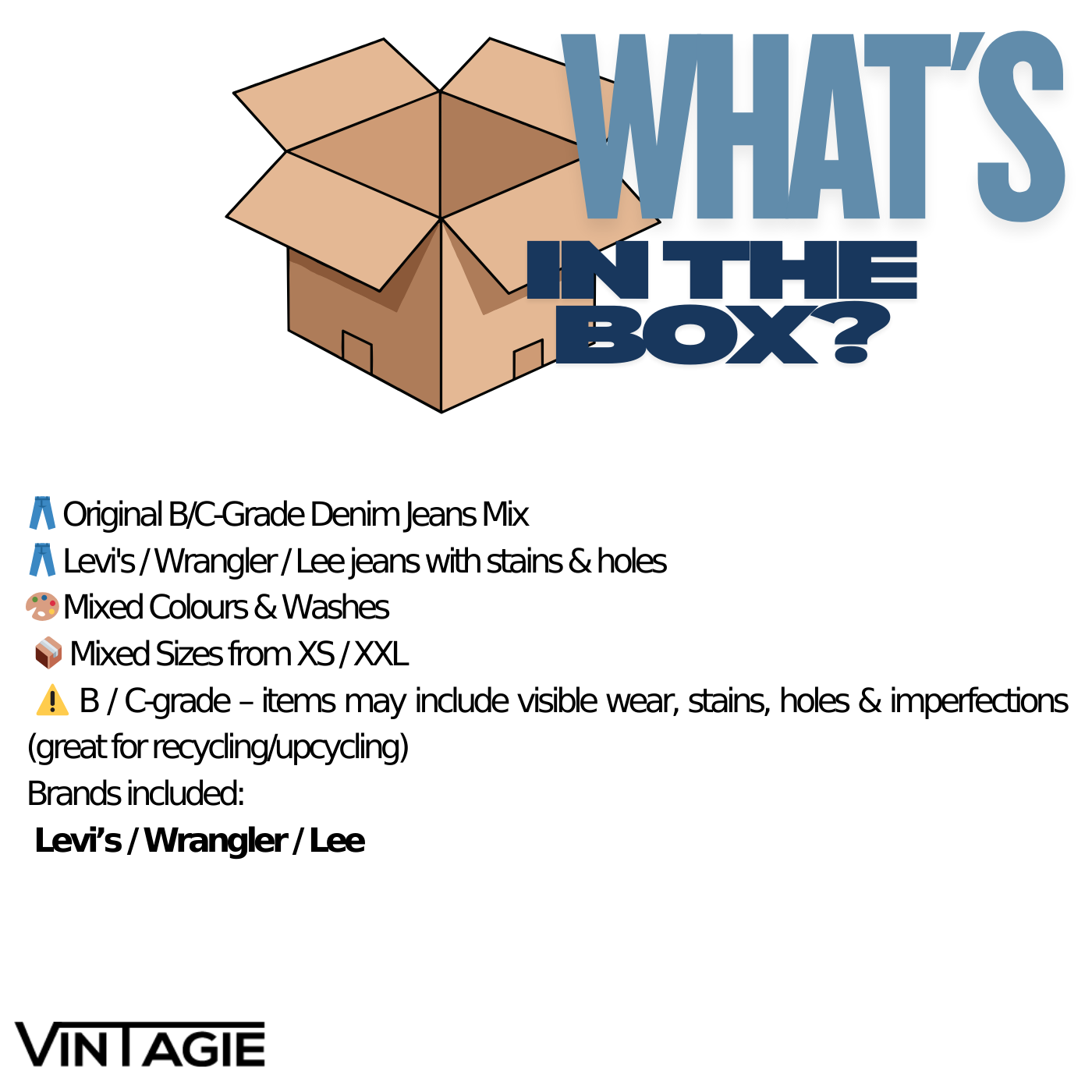 Bij ons shop je tweedehands kleding per stuk. Jij bepaalt precies welke items je wilt — het enige wat telt is dat je minimaal 5 stuks bestelt per categorie. Daarna mag je zelf kiezen hoeveel extra items je toevoegt, wij sorteren een leuke box met een mix van deze categorieën.
