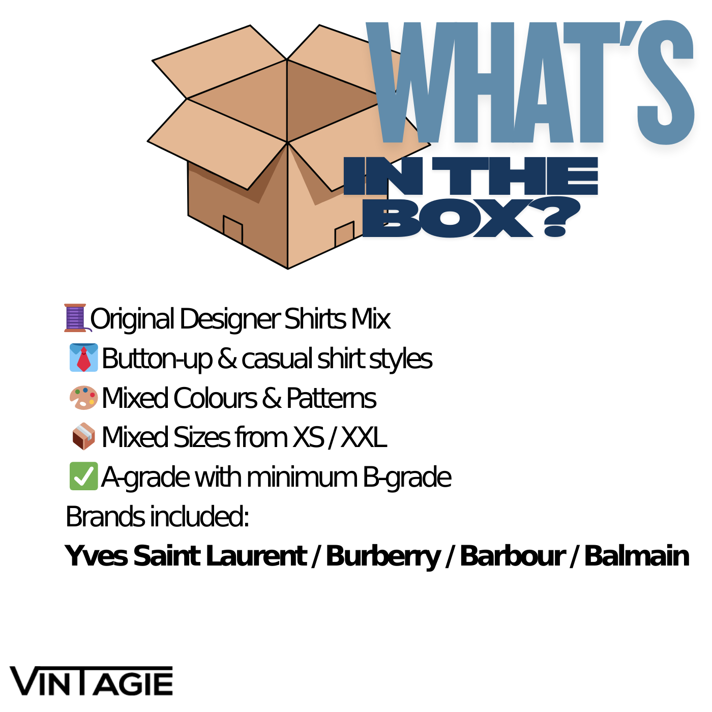 Bij ons shop je tweedehands kleding per stuk. Jij bepaalt precies welke items je wilt — het enige wat telt is dat je minimaal 5 stuks bestelt per categorie. Daarna mag je zelf kiezen hoeveel extra items je toevoegt, wij sorteren een leuke box met een mix van deze categorieën.